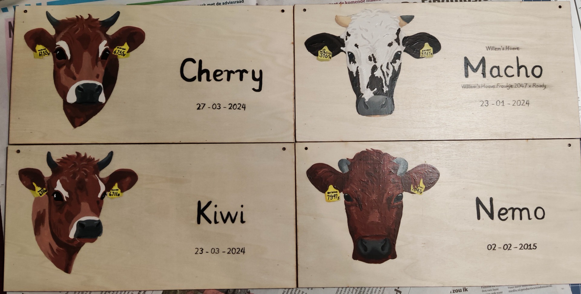 Voor een speciale klus mocht ik leuke naambordjes ontwerpen voor Agrishoots! Ik heb portretfoto's van een aantal koeien gekregen en heb daarvan naambordjes met naam gemaakt! Eerst digitaal getekend en daarna op het hout geschilderd met acrylverf. Aflakken met houtlak zodat het lang mee kan!